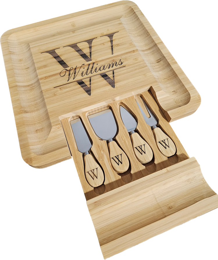 Gift the "gratest" holiday present with our custom engraved cheese board! This versatile gift features a convenient drawer for tools and can be personalized with a name for that special touch. Impress your loved ones with this unique and thoughtful present.