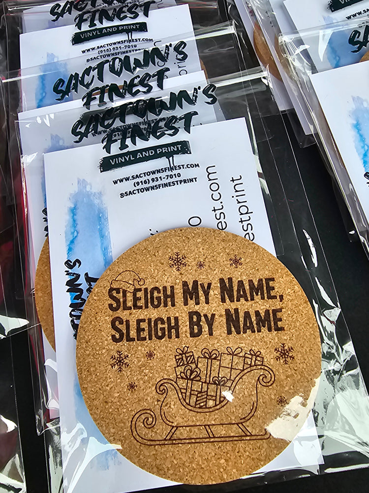 "Sleigh your drink game with our cork coasters featuring a funny holiday saying. Protect your surfaces in style and spread some holiday cheer with a humorous touch. 'Tis the season for Coast through your drinks with our Sleigh My Name Coaster! Made with durable cork, it'll keep your surfaces safe while adding a playful touch to any gathering. With a funny saying, it's sure to bring a smile to your face. Ho ho ho-liday cheers!